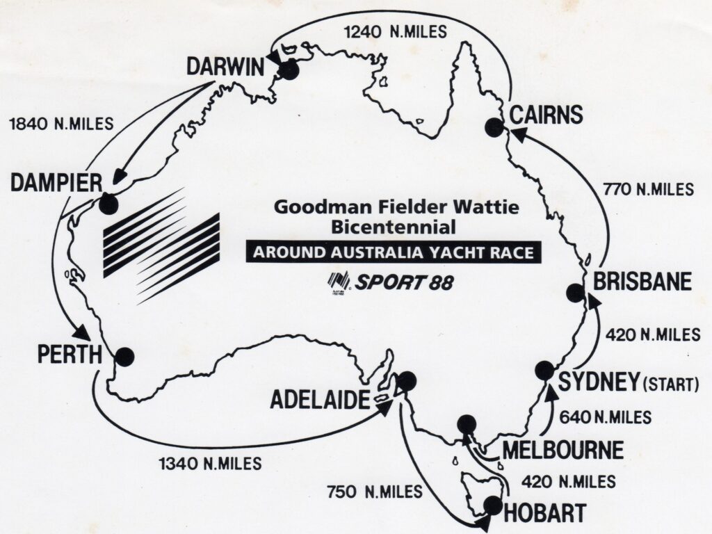 The 1988 Goodman Fielder Wattie Bicentennial Around Australia Yacht Race, began at 0808hrs on August 8, 1988, from Sydney Harbour with a fleet of 25 yachts. The doublehanded “Two Sail 88” fleet consisted of six monohulls and seven multihulls. Another 13 fully crewed yachts also started then, although they raced a different course and format.